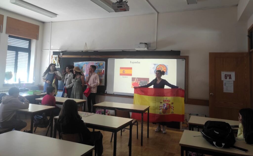 Por sua vez, os alunos do 3º ao 6º ano de escolaridade tiveram a oportunidade de assistir a uma apresentação teatral, dinamizada pelos alunos de 11º ano de Línguas, que teve como objetivo, de forma dinâmica e apelativa, demonstrar o processo de formação e evolução da União Europeia, evidenciando características culturais de cada Estado-Membro que faz hoje parte da UE! Perante a diversidade cultural apresentada conseguiram perceber o lema que caracteriza a União Europeia “Unida na Diversidade”.